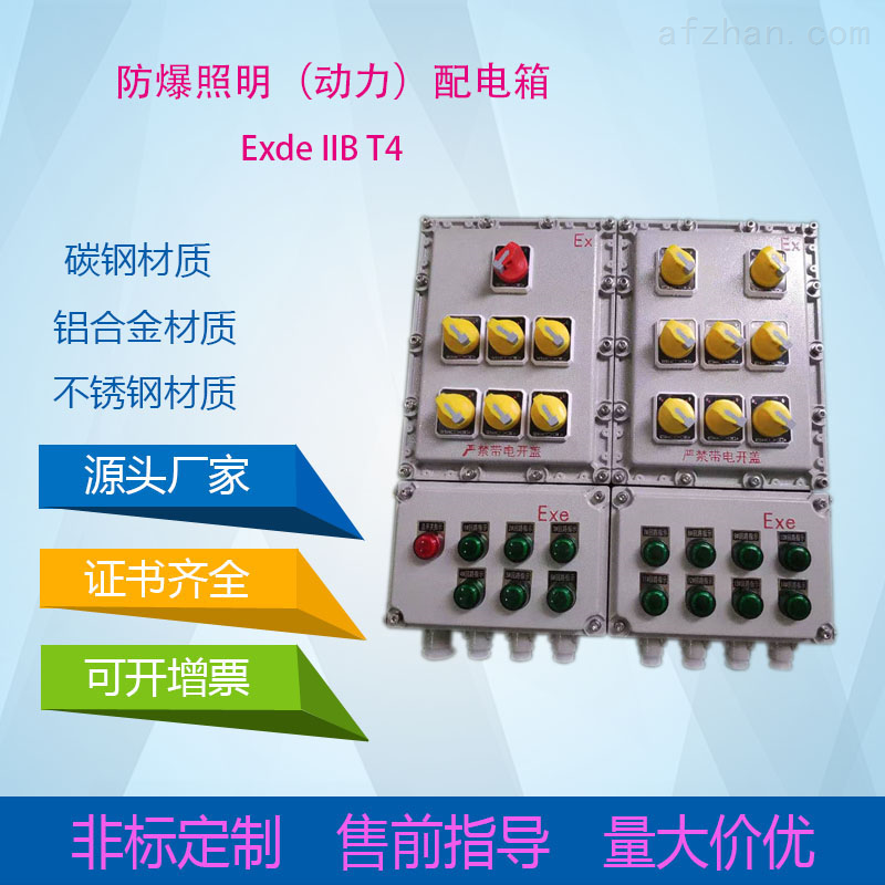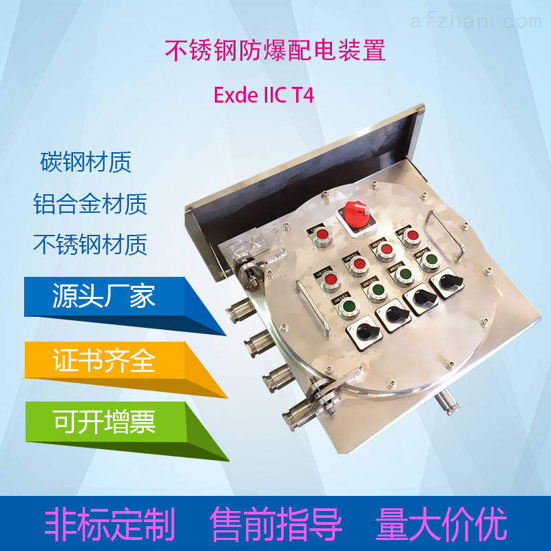 防爆接線盒一般是由鑄造金屬制作。其作用是工作在爆炸氣體環(huán)境下,即使盒內(nèi)具有電路火花出現(xiàn),或者盒內(nèi)也滲透了一些爆燃性氣體,在火花作用下出現(xiàn)小范圍的爆燃,盒子可以經(jīng)受這類情況,不會(huì)因?yàn)楹凶硬唤Y(jié)實(shí),破裂,把火光泄露給環(huán)境,引起大環(huán)境的爆炸。,在電路中作遠(yuǎn)距離操作電磁或?qū)π盘?hào)、控制用電路進(jìn)行通斷、轉(zhuǎn)換控制之用,也可在被控電機(jī)附近就地、間接對(duì)其進(jìn)行起動(dòng)、停止、反轉(zhuǎn)操作;裝有電流表的操作柱還可對(duì)電機(jī)運(yùn)行或電路情況進(jìn)行監(jiān)測(cè)。,電纜進(jìn)出線方向,可按用戶要求做成上進(jìn)上出、上進(jìn)下出、下進(jìn)下出、下進(jìn)上出等多種形式。進(jìn)出線口采用管螺紋,配置電纜夾緊密封裝置,鋼管、電纜布線均可。,對(duì)于防爆配電箱來(lái)說(shuō),殼體是其很重要的一部分,因此,對(duì)其殼體材質(zhì)的選擇我們也應(yīng)根據(jù)配電箱具體使用環(huán)境進(jìn)行考慮,目前市場(chǎng)上比較主流的材質(zhì)有鑄鋁合金、Q235鋼板、不銹鋼板以及工程塑料等等,每一種材質(zhì)都有其各自不同的特點(diǎn)以及優(yōu)勢(shì),額定電壓:AC220/380V, 非標(biāo)準(zhǔn)電壓:12V/24V/36V/127V/660V;總開關(guān)電流:10A—800A;分開關(guān)電流:1A—630A;,防爆插座箱主要是用于檢修電源之用。防爆插座箱的整體結(jié)構(gòu)主要包括:主腔體(隔爆腔)、接線腔(增安腔體)以及防爆插座(或無(wú)火花插銷)組成。其中,防爆插座箱的主腔體主要是用來(lái)安裝斷路器的,通過(guò)面板上面的操作手柄以及操作機(jī)構(gòu)控制;而接線腔主要是安裝接線端子的,用來(lái)引入、接出電纜線之用。,防爆箱屬于非標(biāo)產(chǎn)品,定制類的防爆箱生產(chǎn)時(shí)一般以客戶圖紙為準(zhǔn),所以價(jià)格差別較大,網(wǎng)上價(jià)格僅用于推廣,不作為最終成交價(jià)格,切勿不經(jīng)溝通直接下單,請(qǐng)需要定制的客戶拍前咨詢客服。本公司所售防爆配電箱,有鋁合金壓鑄、鋼板焊接、不銹鋼及工程塑料等材質(zhì)