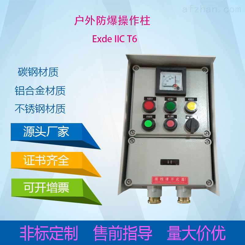工程塑料防爆操作柱 防爆箱殼體控制箱內部元件可根據(jù)用戶的要求進行排列,可實現(xiàn)多種功能,控制開關有多種功能可供選擇。指示燈也有多種顏色可供選擇。由于該產(chǎn)品變化種類多,訂貨時請?zhí)峁┚€路圖。防爆控制箱外殼采用鋼板焊接或鑄鋁合金壓鑄成型, 表面高壓靜電噴塑,產(chǎn)品整體一般采用隔爆型外殼和增安型外殼組合成的復合型結構。 ,防爆儀表箱設計根據(jù)國家標準GB3836-2000,防爆外殼結構,可做成上下隔爆腔,單個隔爆腔,也可做成快開門結構;帶按鍵觀察窗防爆儀表箱防爆外殼可根據(jù)客戶圖紙要求定制,也可提供需要相應的尺寸,由我公司出圖紙給客戶確認生產(chǎn),帶按鍵觀察窗防爆儀表箱防爆外殼的防爆出線口數(shù)量,防爆出線口大小,箱體蓋板上的防爆按鈕,信號燈的數(shù)量可根據(jù)客戶的要求,門蓋上的觀察窗,也可根據(jù)客戶要求尺寸開孔,有多種規(guī)格的插座便于檢修用電源。,電動機變頻調速箱可通過改變其輸出頻率來調節(jié)普通三相異步電動機的轉速,以達到生產(chǎn)工藝的要求,或實現(xiàn)節(jié)電的目的,節(jié)電率可達30%~60%,也可作為電動機軟啟動控制器,也可通過傳感器、變送器等控制電路組成閉環(huán)調速系統(tǒng),安裝操作簡單,起動平衡無沖擊電流(軟啟動),電源容量大大降低,功率因數(shù)恒定,同時具備故障顯示等各種功能,由于調速變頻器的核心器件是單片微機,因此具有很強的功能,安裝時需將電纜穿過密封圈、金屬墊圈、用壓緊螺母壓緊,保證密封及電纜不得松動,不使用的接線口應用密封圈和金屬墊片加以封堵;,可從顔色或形式上來區(qū)分總開關和分開關;,總開關分開關操作面板顏色區(qū)分明顯,便于現(xiàn)場識別;,防爆控制箱一般有復合型和隔爆型兩種結構。復合型外殼采用增安型結構,內裝元件采用隔爆型元件或增安型的元件;外殼采用ZL102鋁合金壓鑄成型,表面高壓靜電噴塑,內裝的元件有按鈕、指示燈、控制開關、儀表等均為防爆元件。